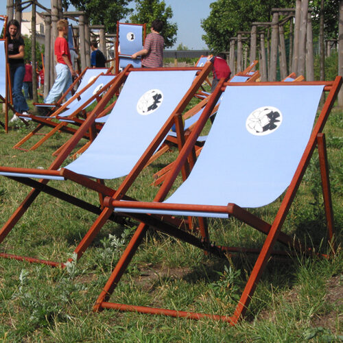 Mitten im Park wird ein hellblauer Container mit 100 hellblauen Liegestühlen platziert, die im Sommer die Sitzmöglichkeiten im Park erweitern. Für drei Wochen können Besucher täglich einen Liegestuhl ausleihen und dort Platz nehmen, wo sie wollen. Das Aussehen der Anlage wird durch die Platzwahl der Besucher strukturiert. Neue Lieblingsplätze entstehen, man sitzt zusammen, das Sitzen im Park nimmt täglich neue Formen an. Die verhaltene Reaktion auf dieses Angebot wird zum Barometer der Befindlichkeit, das in großer Deutlichkeit zeigt, wie unzufrieden viele Anwohner mit dem ungepflegten Zustand des Parks sind. Der Werkstattcontainer wird zur Adresse für diese Beschwerden, die in der Folge auch alle behördlichen Beteiligten beschäftigen und ein Begleitthema des gesamten Projekts werden.