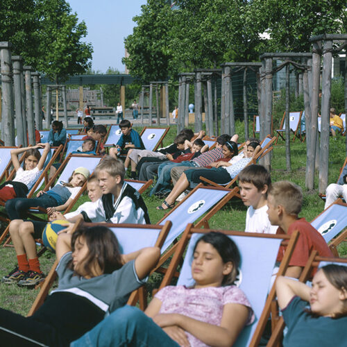 Placed in the middle of the park is a light-blue container with 100 light-blue deckchairs that supplement the seating possibilities in the park in the summer. For three weeks, visitors can borrow a deckchair each day and find a place to sit wherever they would like. The appearance of the site is structured by the locations that visitors select. New favourite places come into being, people sit together, and sitting in the park takes on new forms each day. The restrained reaction to this offer becomes a barometer of sensitivities that clearly show how dissatisfied many residents are with the untended condition of the park. The container of the Werkstatt für Veränderung (Workshop for Change) becomes the address for these grievances, which, consequently, also occupy all the administrative participants and become a theme that accompanies the project as a whole.