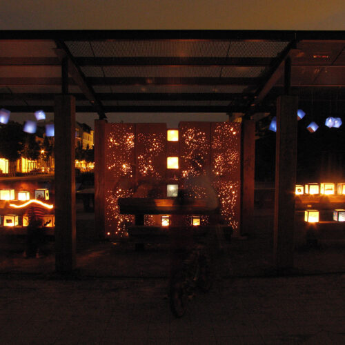 In the summer of 2004, the Werkstatt devotes itself to the subject of light, and mainly takes place after nightfall. There is an evening of readings during which a standard lamp stands next to each of the 26 benches, as if the lamps have wandered from neighbouring living rooms into the park. For the lantern lounge, lights are built in the workshop in the park and assembled to create a large ensemble. On the final evening, all the neighbours are invited bring a light source and create a lighted location in their park. They gather under trees and attempt to coordinate their torches without outside assistance. On each of these evenings of light, Carl-Weder-Park seems cosy, and those who have come stay for a long time — without any entertainment programme at all.